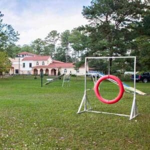 - Leash-free five-acre private fenced dog park with obstacles and open running space